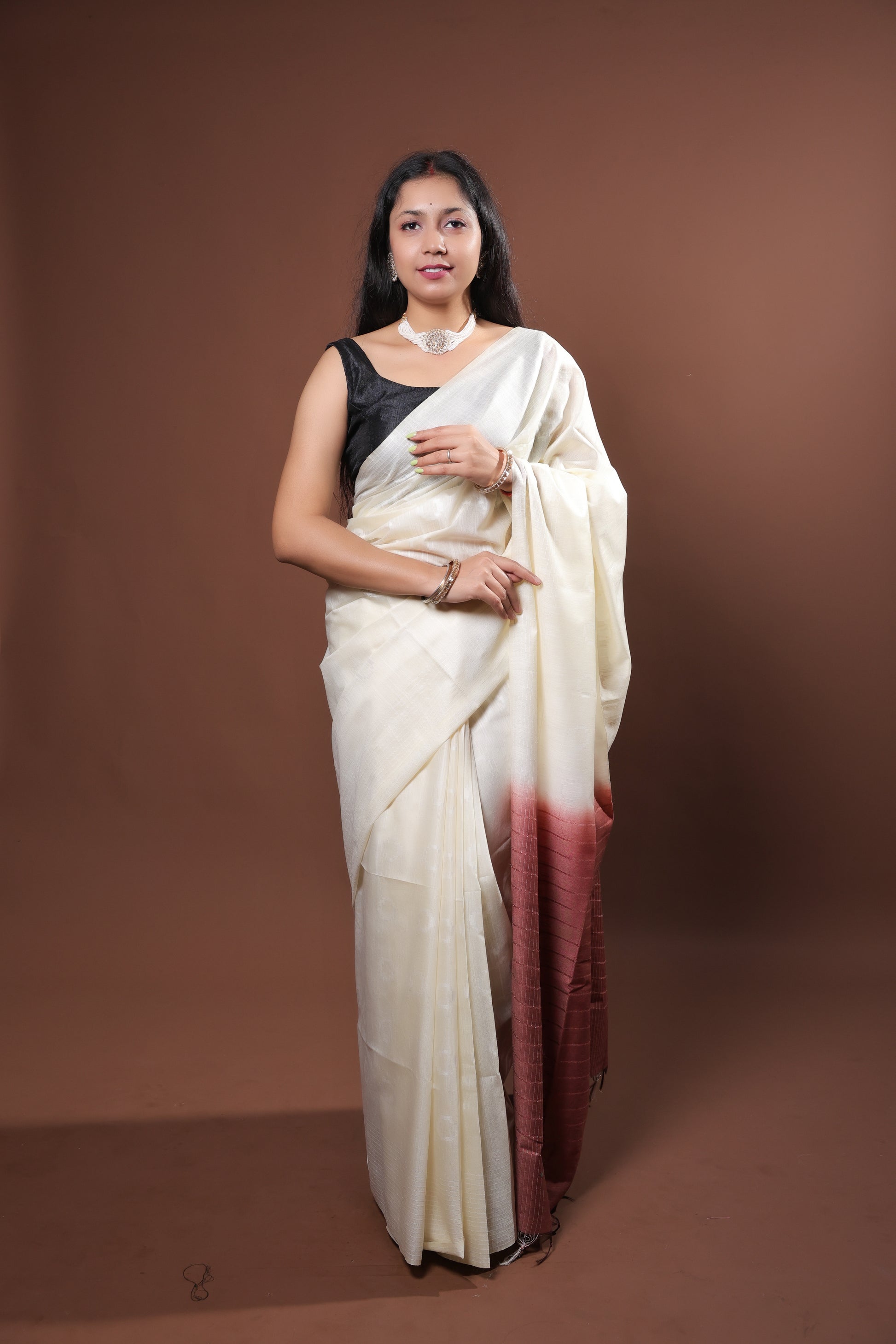 white plain saree with red pallu and Sequence work