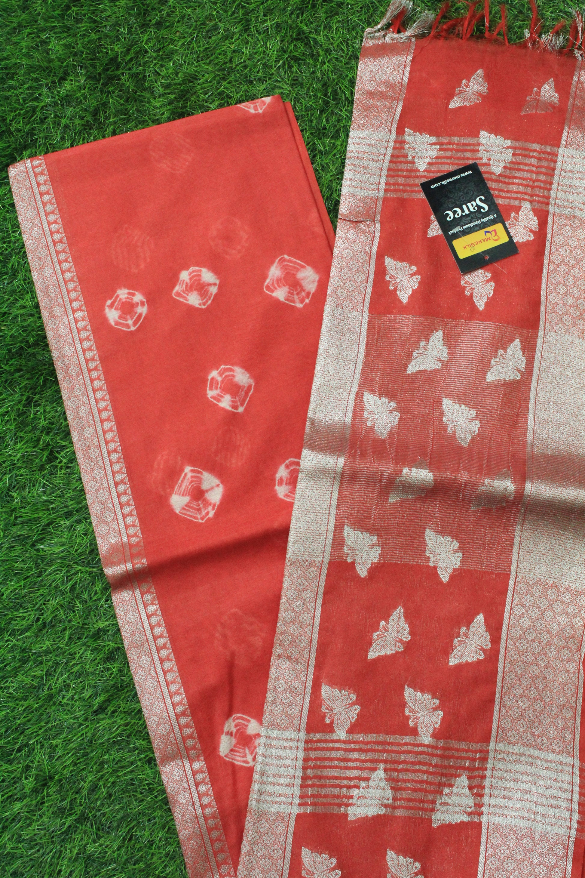 Designer saree with silver zari butterfly and bandhani print