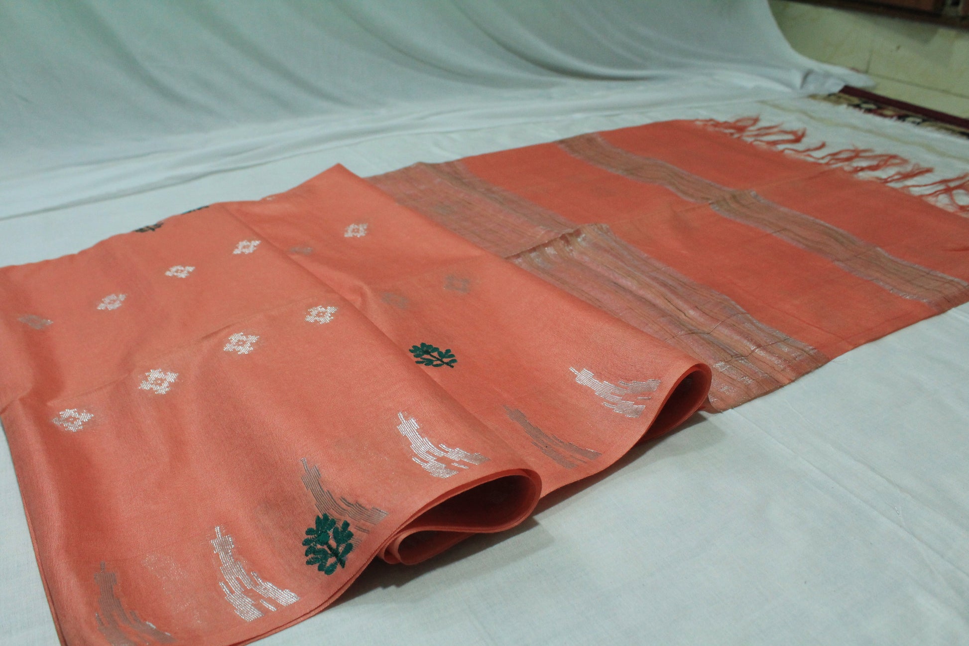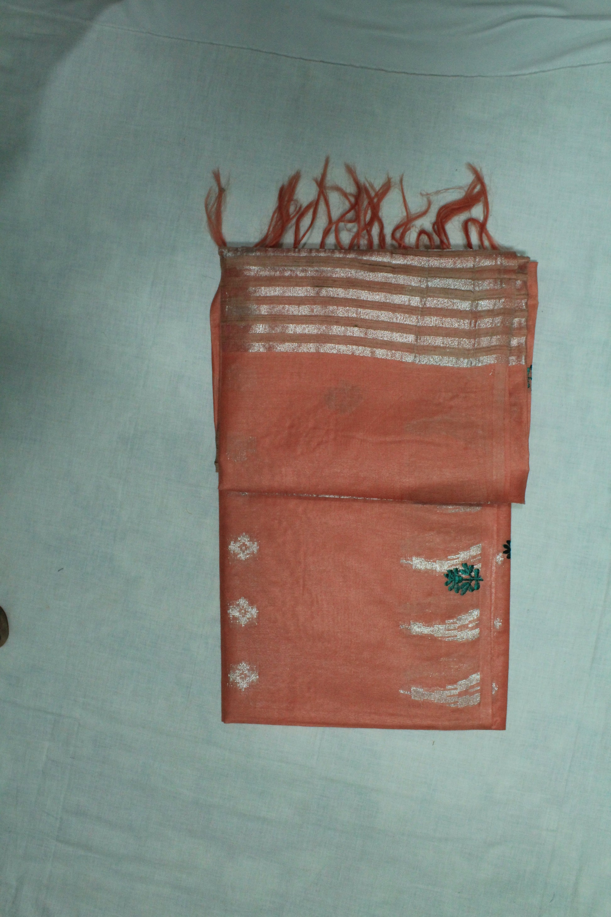 Embroidery saree with beautiful silver zari in light orange color