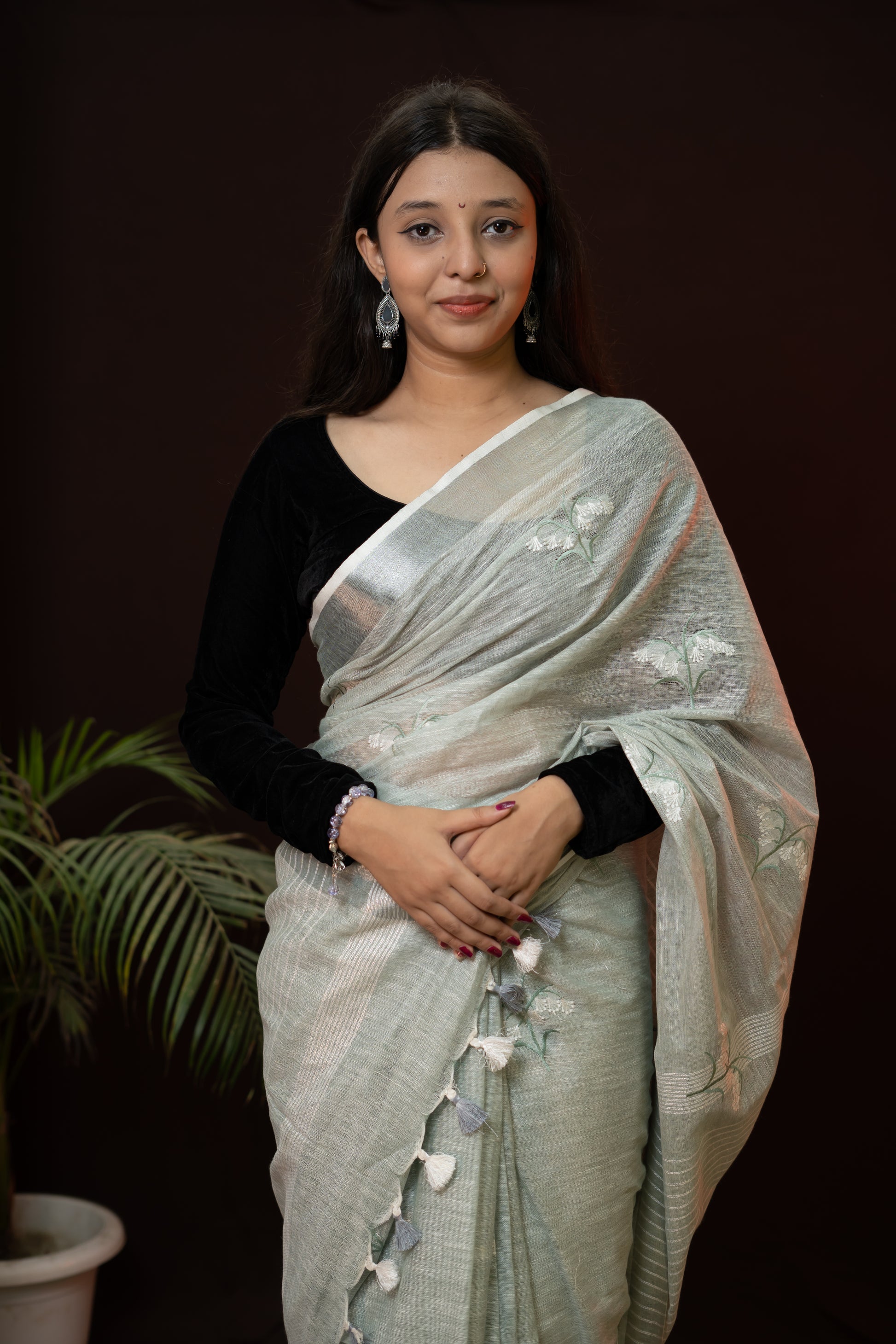 Linen Saree with enriched Silver color with beautiful embroidery